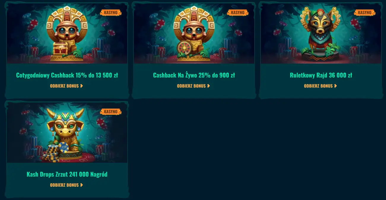 | Wyścig Miesiąca CashCrab | Pul nagród: 9 875 PLN Minimalna stawka: 2,45 PLN Okres trwania: Pierwszy – ostatni dzień miesiąca Gry / Wydarzenia: Wszystkie gry CashCrab Przyznawanie punktów: Za każdy zakład: obliczane na podstawie zakładu, wygranej i typu kulki Nagrody: Prawdziwe pieniądze bez wymagań obrotu Uwagi: Minimalna stawka 2,25 PLN; maksymalna 450 PLN; zamknięcie konta = utrata nagród |